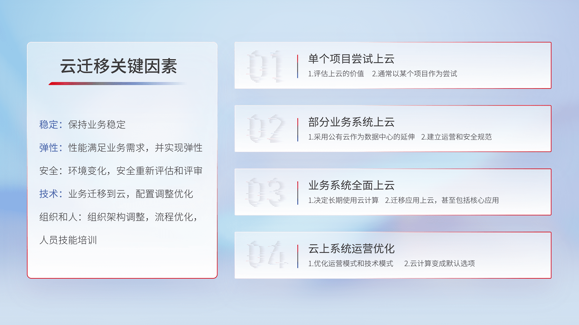 结合实际业务,,,,从规划设计、、、云平台选型、、云原生改造、、、、数据迁移、、、集成交付,,,,迁移全过程为客户识别最佳上云路径,,做好风险识别管理,,设计网络架构、、、身份权限、、安全审计合规、、、、操作审计、、、、日志审计、、、监控告警策略、、、多站点容灾设计等,,,,对云上基础设施进行整体规划,,,提升IT治理水平,,以满足弹性、、、、高可用、、、高性能的需求。。。。